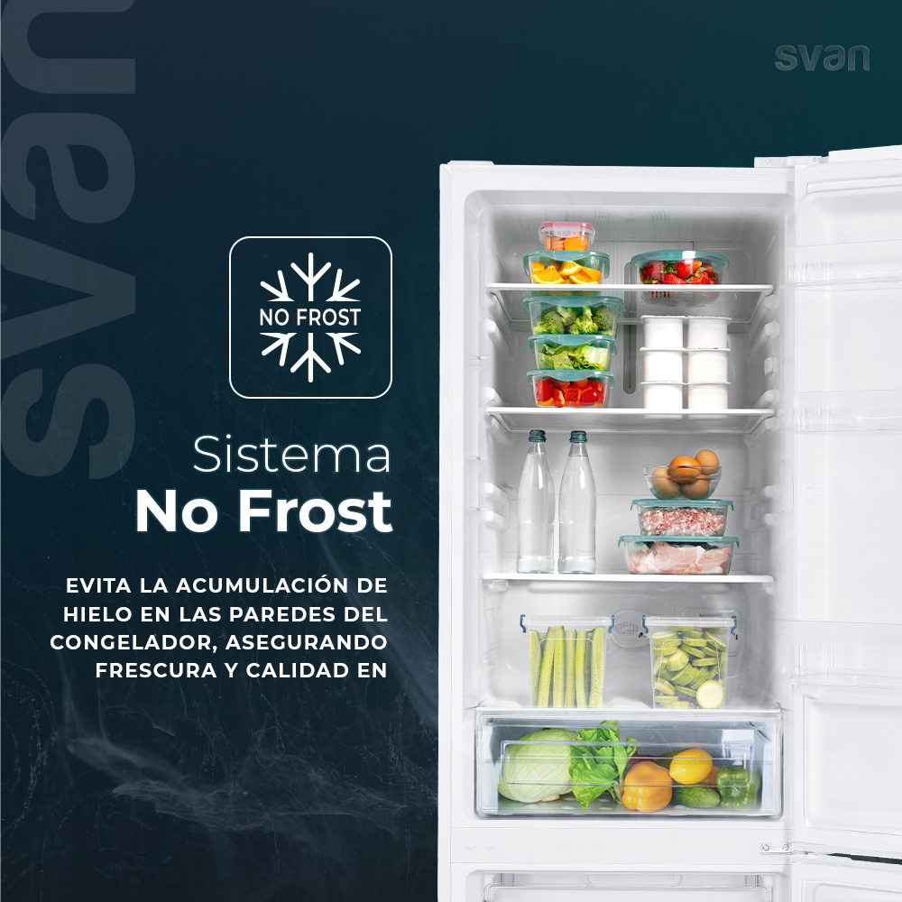 – La tecnología No Frost garantiza una óptima conservación de los alimentos y evita la formación de hielo y escarcha en el frigorífico. Junto con la ventilación Multi Air Flow, consiguen una distribución uniforme en toda la cavidad y un enfriamiento más rápido.