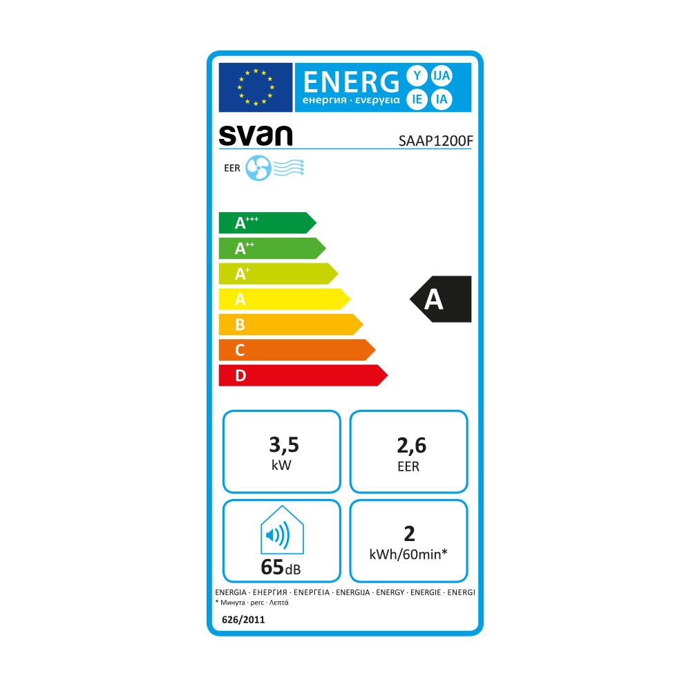 Air avec gaz réfrigérant R290, mode de fonctionnement refroidissement seul et capacité de 12000 BTU. Efficacité énergétique de refroidissement A. Niveau sonore de 65 dB.