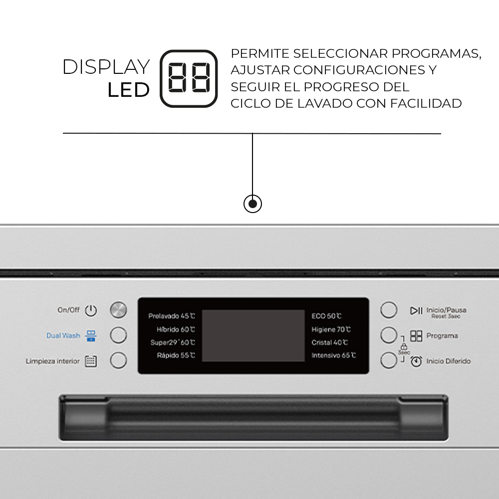 Esthétique blanche avec 3 plateaux et un panier à couverts. Système de contrôle électronique avec écran LED et 8 programmes et fonctions de lavage pour garantir les meilleurs résultats et l'entretien de la vaisselle.