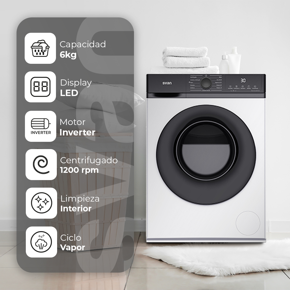 Lavadora Svan,Capacidad 6kg 1200rpm, Clase A. Dimensiones: 84,5cm 59,8cm 42,3cm. Color Blanco, Control con Display. Motor Inverter. Programas: Vapor.
