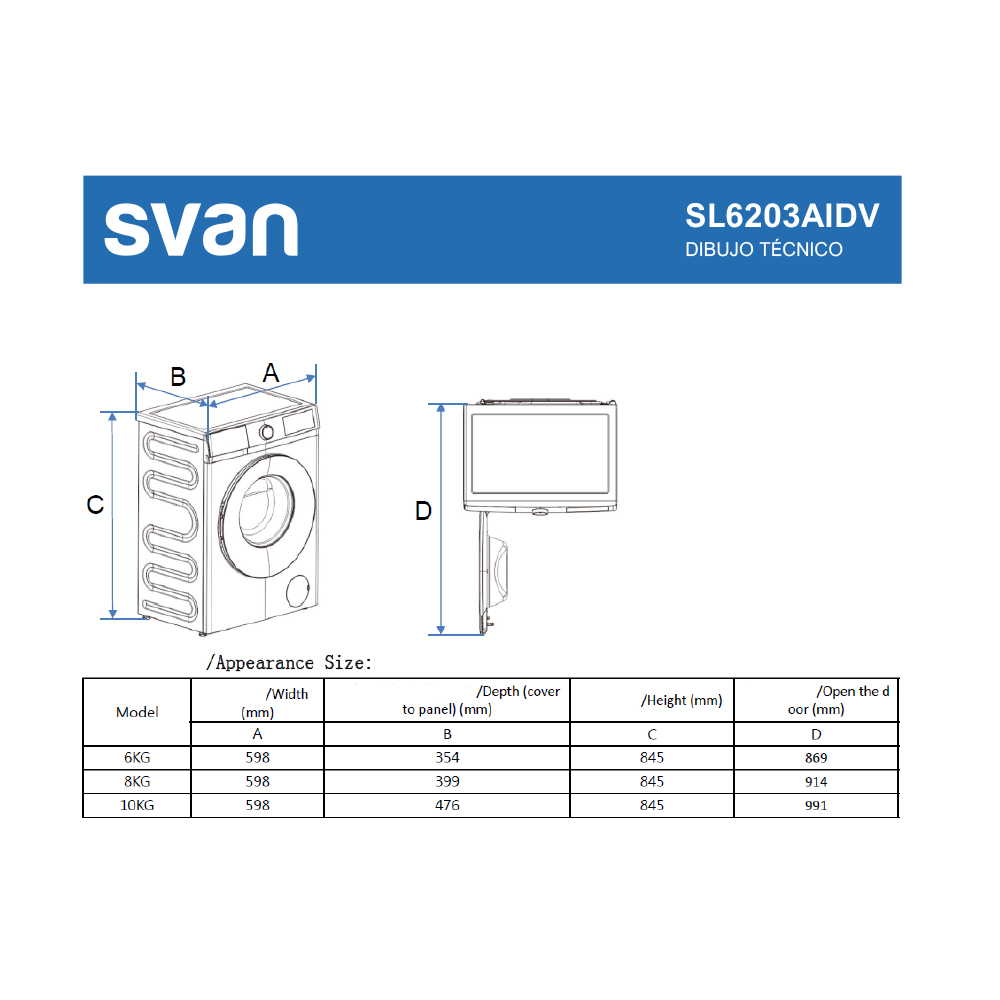Lavadora carga frontal de Svan modelo SL6203AIDV.